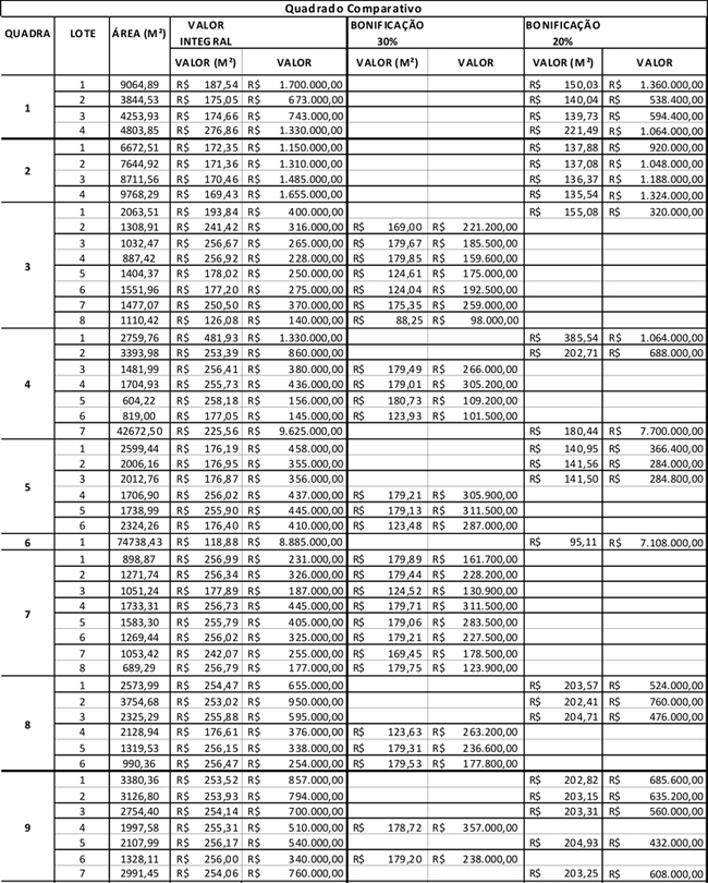2.1. O preço do metro quadrado dos terrenos da SUPPIN no Polo Empresarial do Cercado da Pedra, bem como os percentuais de bonificações estão indicados no Anexo Único.
