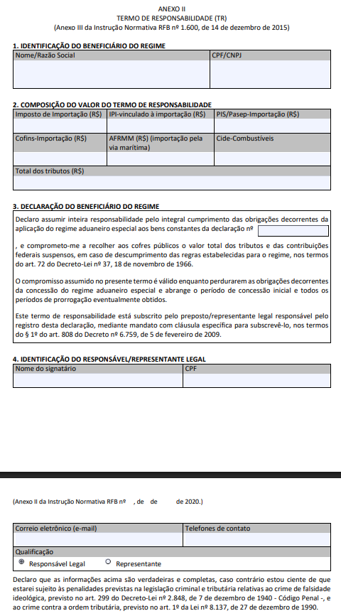 ANEXO III - TERMO DE RESPONSABILIDADE (TR) (Anexo acrescentado pela Instrução Normativa RFB Nº 1989 DE 10/11/2020, com efeitos a partir de 01/12/2020).