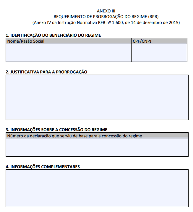 ANEXO IV - REQUERIMENTO DE PRORROGAÇÃO DO REGIME (RPR)(Anexo acrescentado pela Instrução Normativa RFB Nº 1989 DE 10/11/2020, com efeitos a partir de 01/12/2020).