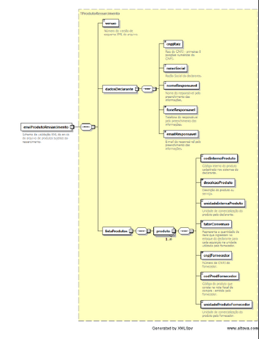 | C01 | dadosDeclarante | G | A01 | 1-1 | Dados do contribuinte declarante do arquivo de produtos | |||