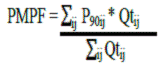 Desta forma o PMPF de cada produto listado neste comunicado é a média de todos os P90, calculados em cada dia e em cada estabelecimento, ponderada pela quantidade comercializada em cada dia por cada contribuinte. Ou seja, após descartar os vinte por cento menores P90, o PMPF é calculado pela fórmula seguinte: