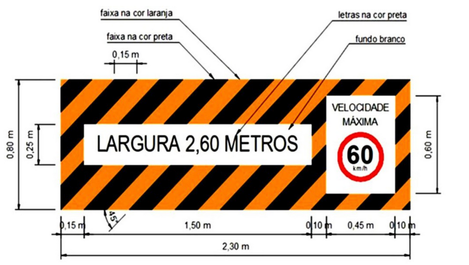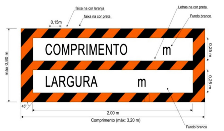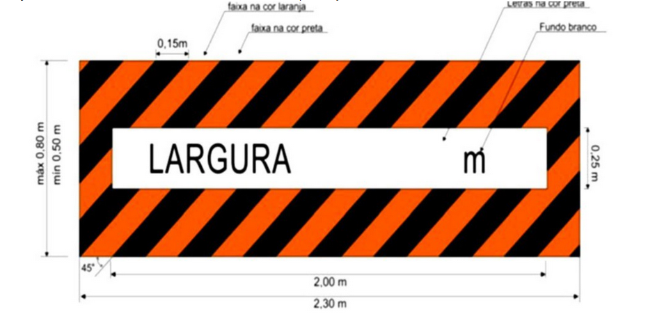 Especificações: dispositivo de segurança autoadesivo aplicado diretamente no veículo ou sobre placa metálica, de madeira ou material com propriedades equivalentes, possuindo faixas inclinadas de 45º da direita para a esquerda e de cima para baixo, com adesivo refletivo na cor preta e laranja alternadamente, com espaçamento máximo de 5,0 cm entre as duas partes sem alterar ou comprometer as letras e formato da sinalização, nas cores preta e laranja, alternadamente. As cores: branca e laranja devem ser em material retrorrefletivo com especificações técnicas constantes no item V deste Anexo.
