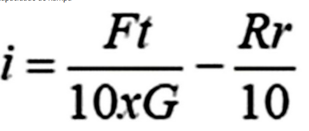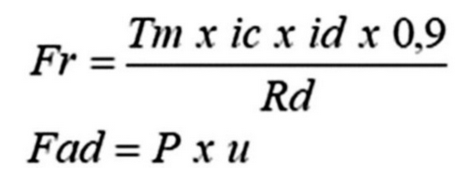 Ft = Força de tração em kgf, determinada pelo menor valor entre a Força na roda (Fr) e a Força de aderência (Fad), calculados da seguinte forma: