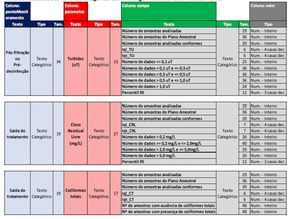 | Iql_CT | Índice de desempenho qualitativo das análises de Coliformes Totais na Saída da ETA ou UTA | [(Número mensal de amostras de coliformes total que atendem ao padrão estabelecido na Portaria)/(Número mensal de amostras de coliformes total analisadas) ] *100 | >=95% |