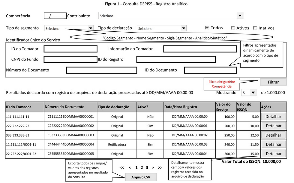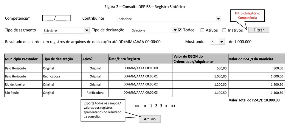 2. O arquivo de retorno da consulta à DEPISS - Registo Analítico deverá conter todas as informações declaradas, conforme a competência do ente político pesquisador, a exemplo do modelo da Tabela 1.
