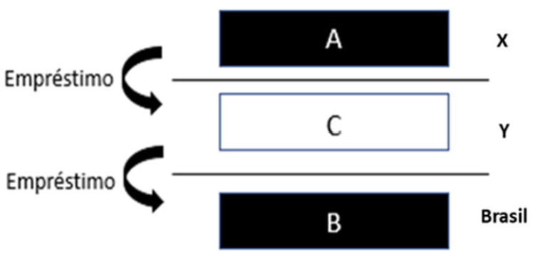 "A" é a controladora do grupo multinacional "AB" e é residente na jurisdição X. "B" é pessoa jurídica residente no Brasil e controlada por "A". "C" é instituição financeira residente na jurisdição Y e não faz parte do grupo "AB". "A" efetua empréstimo para o banco "C" que, por sua vez, empresta o recurso para "B".