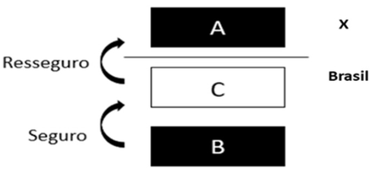 "B" firma um primeiro contrato de seguro com "C" que, por sua vez, efetua o resseguro com "A", transferindo a maior parte ou a totalidade do risco e do prêmio de seguro para esta última entidade. Com isso, o ressegurador subscreve o risco de seguro do grupo por meio de parceria com uma seguradora "terceirizada" ("C"). "C" emite as apólices de seguro locais e, em seguida, transfere parte do risco para a entidade cativa de resseguros do grupo ("A").