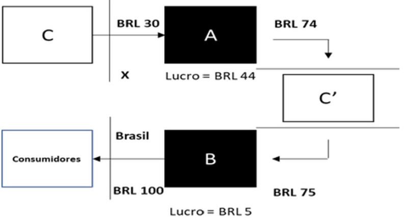 "A" adquire produto fabricado por terceiro ("C") por BRL 30 e revende diretamente para parte não relacionada (C') por BRL 74. C' efetua a revenda para "B" por BRL 75. O produto adquirido por "A" é encaminhado diretamente para "B". "B" realiza a comercialização do produto no mercado brasileiro por BRL 100 e obtém lucro de "5", após computar o custo do produto adquirido e as despesas relevantes com marketing e comercialização.