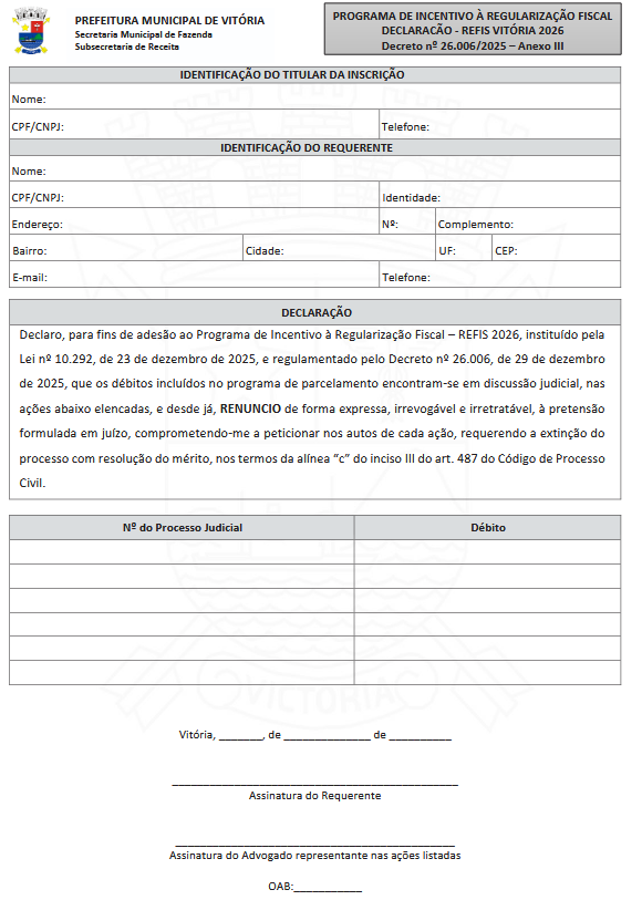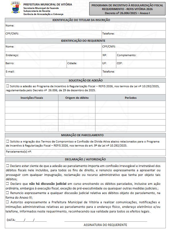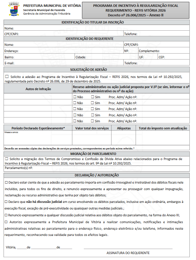 Art. 2º. O pedido de adesão ou migração ao REFIS VITÓRIA 2026 será formalizado por meio de requerimento próprio, conforme formulários constantes dos Anexos I, II e III deste Decreto, disponíveis: