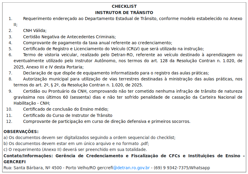 Art. 1º Para concessão da autorização voltada ao exercício da atividade de Instrutor de Trânsito, o profissional deverá atender aos requisitos previstos no art. 4º da Lei n. 12.302, de 2 de agosto de 2010, na Resolução Contran n. 1.020/2025, bem como apresentar os seguintes documentos a esta Autarquia de Trânsito, conforme checklist do Anexo I: