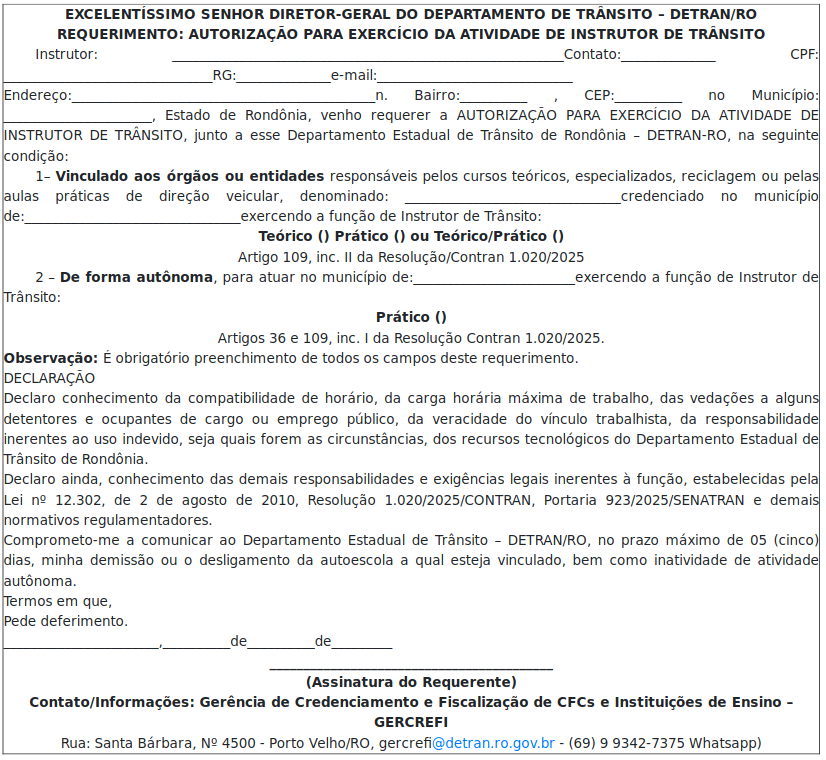 Considerando a necessidade de estabelecer procedimentos referentes à autorização para o exercício da atividade de Instrutor de Trânsito no âmbito do Estado de Rondônia, nos termos da Lei n. 12.302/2010 e Resolução Contran n. 1.020 de 2025; e