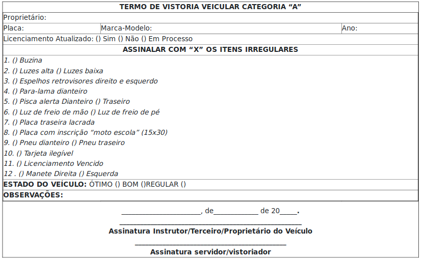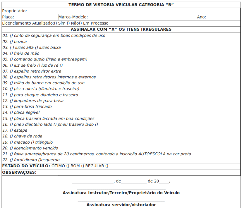 VI - termo de vistoria veicular, realizado pelo Detran-RO, referente a veículo destinado à aprendizagem ou eventualmente utilizado pelo Instrutor Autônomo, nos termos do art. 128 da Resolução Contran n. 1.020, de 2025;