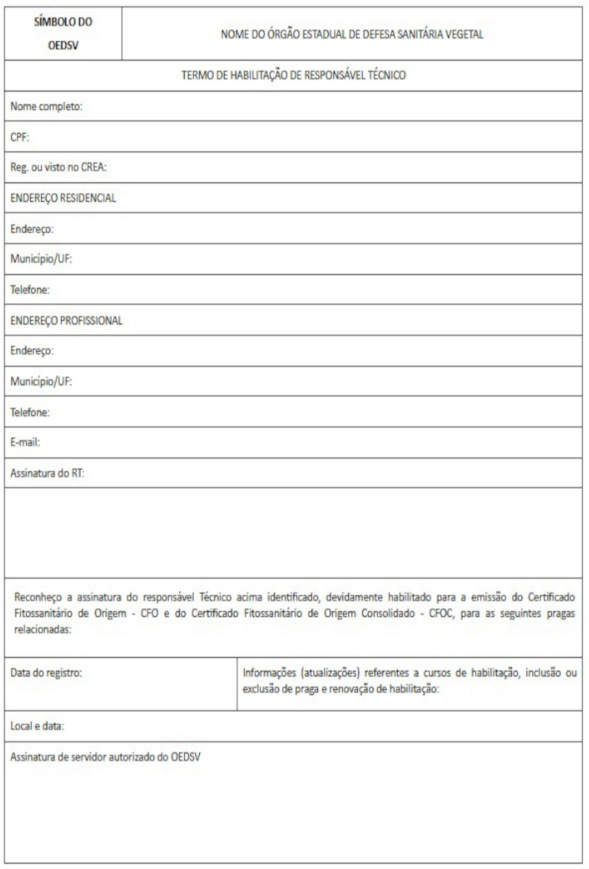 XXVII - responsável técnico: engenheiro agrônomo ou engenheiro florestal, devidamente habilitado junto ao órgão estadual de defesa sanitária vegetal para atuar no âmbito do Sistema Nacional de Certificação Fitossanitária de Origem, respeitadas as suas áreas de atuação;