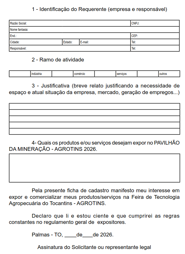 Com objetivo de captar empresas expositoras do segmento da indústria, comércio e serviços do setor mineral, para a 26ª Feira de Tecnologia Agropecuária do Tocantins - AGROTINS 2026, a realizar no período de 12 a 16 de maio de 2026.