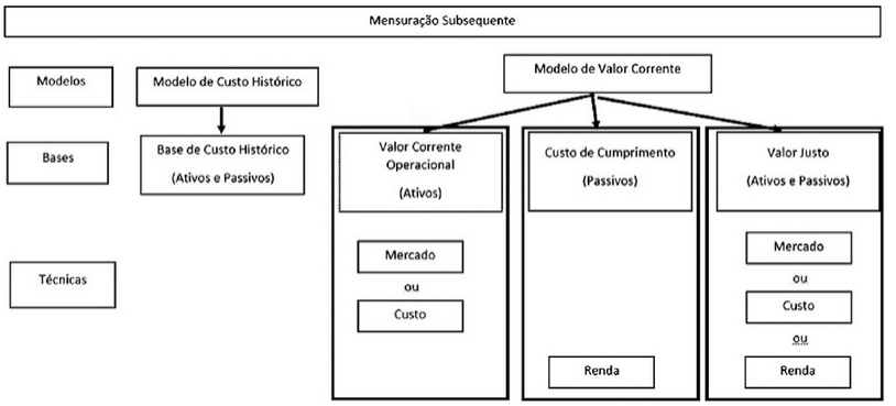 O diagrama a seguir estabelece a estrutura de mensuração subsequente com base na Estrutura Conceitual: Capítulo 7, Mensuração de Ativos e Passivos nas Demonstrações Contábeis. Este diagrama ilustra os três níveis de mensuração e os relacionamentos entre eles.