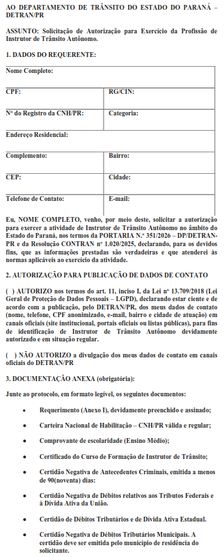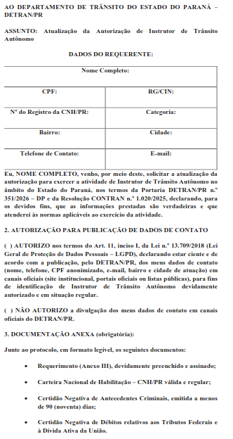 Art. 3º. O interessado em exercer a atividade de Instrutor de Trânsito Autônomo deverá solicitar autorização ao DETRAN/PR, por meio de requerimento protocolado exclusivamente via formulário eletrônico1, disponibilizado no sítio eletrônico do DETRAN/PR, instruindo o pedido com: