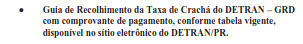 IX. Guia de Recolhimento da Taxa de Crachá do DETRAN – GRD com comprovante de pagamento, conforme tabela vigente, disponível no sítio eletrônico do DETRAN/PR.