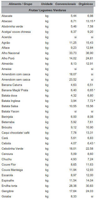 1) os preços foram ajustados conforme o seguinte critério: quando a média de variação, subtraída ou acrescida do desvio padrão, foi extrapolada, o preço orgânico foi calculado mediante a multiplicação do preço convencional do produto pela variação estabelecida exclusivamente entre pesquisas realizadas em locais com produção simultânea convencional e orgânica, denominada, neste caso, de variação local;