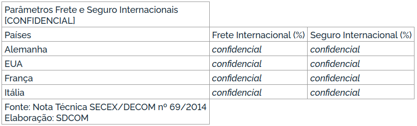 Assim, foram considerados para cálculo do preço provável das importações originárias da Alemanha, dos EUA, da França e da Itália, o preço de exportação médio na condição FOB em dólares estadunidenses praticado no período de julho de 2018 a junho de 2019. A esse preço foi somado o valor unitário do frete e do seguro internacional, calculados com base no percentual de representação de seus valores sobre o preço CIF das importações de cada origem apurados na investigação original (frete: [RESTRITO] % para Alemanha, [RESTRITO] % para os EUA, [RESTRITO] % para a França e [RESTRITO] % para a Itália; e seguro internacional: [RESTRITO] % para todas as origens).