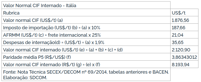 Tendo sido verificada a existência de prática de dumping nas exportações para o Brasil e de dano à indústria doméstica decorrente de tal prática, a investigação foi encerrada com a aplicação de direito antidumping definitivo sobre as importações de ácido adípico, exceto ésteres de ácido adípico, originários da Alemanha, da China, dos EUA, da França e da Itália, por um prazo de 5 anos, sob a forma de alíquota específica, por meio da Resolução CAMEX nº 15, de 31 de março de 2015, publicada no DOU de 1º de abril de 2015, conforme tabela a seguir: