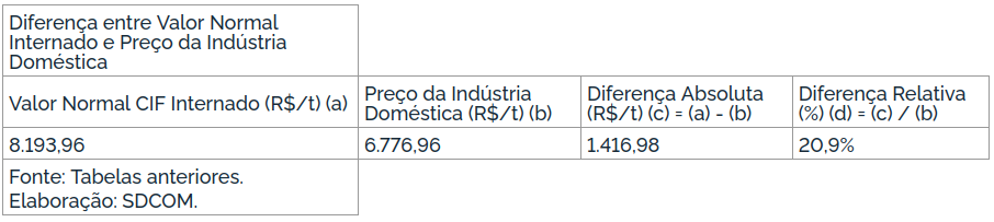 Quando considerados os preços praticados pela indústria doméstica em reais, observou-se retração apenas de P2 para P3 (-18,2%), ao passo que nos demais períodos se observou elevação. De P1 para P5, o preço da indústria doméstica praticado no mercado interno tendeu à estabilidade, apresentando elevação de 0,5%. Dessa forma, não se pode afirmar ter ocorrido depressão desses preços.
