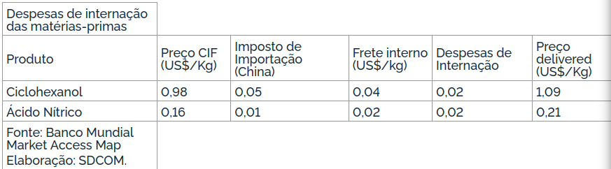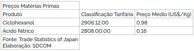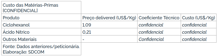 Segundo consta da petição, as matérias-primas utilizadas na produção do ácido adípico são: Ciclohexanol; e/ou Mistura de ciclohexanol e ciclohexanona (olona ou KA oil); e Ácido Nítrico;