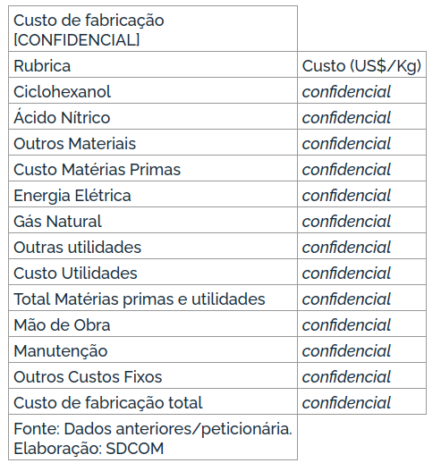 Com relação ao consumo cativo, observou-se, que do volume do ácido adípico produzido pela indústria doméstica, foram destinados para consumo cativo [CONFIDENCIAL] % em P1 e [CONFIDENCIAL] % em P5, ou seja, um decréscimo de [CONFIDENCIAL] p.p no período de revisão. Apesar da queda observada na participação do volume de produção destinado ao consumo cativo pela indústria doméstica, esse volume apresentou crescimento, em termos absolutos, de [CONFIDENCIAL] % no período de revisão.