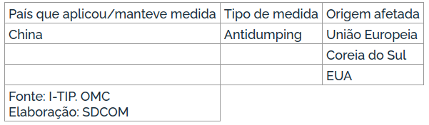 Consoante o discorrido no item 5.6, a China mantém medidas de defesa comercial em face das importações originárias da União Europeia, da Coreia do Sul e dos EUA.