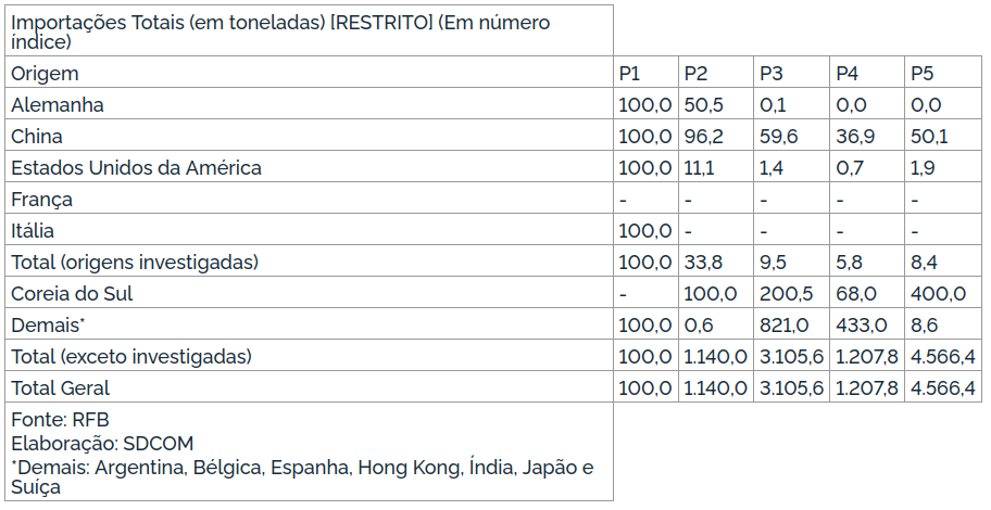 Verificou-se, a partir da análise das importações brasileiras de Ácido Adípico que o volume das importações oriundas das outras origens aumentou 4.454,5% ao longo do período investigado (278,1%, passando de [RESRITO] toneladas, em P1, para [RESRITO] toneladas em P5., com destaque para as importações originárias da Coreia do Sul, que responderam por 9,8% em volume.
