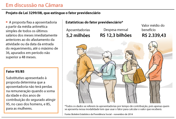 Os deputados que tomam posse em 1º de fevereiro poderão decidir pelo fim ou pela manutenção do fator previdenciário. Esse mecanismo de cálculo das aposentadorias foi criado em 1999 (Lei 9.876/99) com o objetivo de criar uma relação entre o tempo de contribuição do segurado e o valor do benefício. Ele se baseia em quatro elementos: valores recolhidos, idade do trabalhador, tempo de contribuição à Previdência Social e expectativa de sobrevida da população, segundo projeção do Instituto Brasileiro de Geografia e Estatísticas (IBGE).